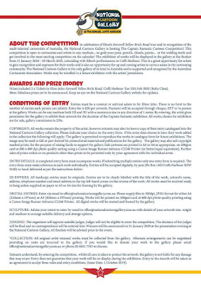 This Competition is open to cartoonists and artists in any medium…so grab your pens, pencils, chisels, paints…or the welding torch and get involved in the most exciting competition on the calendar! A selection of works from the competition will adorn the gallery walls from 31 January to 29 March 2020.