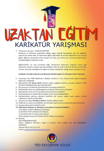 3- Karikatürler 29 Nisan 2020 tarihine kadar aşağıda belirtilen yarışma adresine (TED Eskişehir Kolejine) posta ile ulaştırılacaktır.